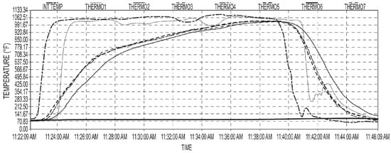 The cold-rolled strips are punched into the discs (slugs) of a diameter of about 44.65 mm and a thickness of about 3–14 mm (0.12–0.55 inches). It is reported that slugs of various shapes, such as triangles, ovals, circles, squares, diamonds, rectangles, or pentagons, might be used depending upon the shape of the die and/or the desired end product. It has been reported that it is optional to apply the annealing treatment to the punched slugs or materials to give more ductility (formability) and form a homogeneous, equiaxed grain structure prior to the mechanical deformation (bottle manufacturing). The annealing process causes the recovery and recrystallization. Two types of the annealing treatments could be considered: batch annealing and continuous annealing. In the batch annealing, the annealing temperatures could be 470–600 °C, and the holding time is 5–9 h, depending on the alloy composition. Then the slugs are subjected to the furnace cooling, which might reduce the hardness to some extent. An inert gas may be circulated in the furnace to minimize the oxidation. In the continuous annealing (Figure 2), the materials are quickly heated up, kept at the higher temperature (450–570 °C) for a shorter time, and then quenched. The entire continuous annealing might be around 20–25 min (Figure 2). The continuous annealing process may be conducted in air. The peak temperature depends on the alloy chemical composition [3,4].