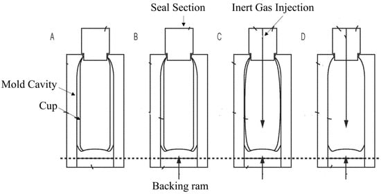 The blow forming of the materials could be carried out at the room temperature or at 200–300 °C. Accordingly, the deformed materials are pre-heated to the temperature of 200–300 °C and are then placed into the mold cavity to conduct the blow forming (Figure 4A). The mold cavity might consist of two or more mating segments, which are separable to simplify ejecting the formed container. The mold cavity might be subjected to the pre-heating at temperature of 200–300 °C. The mold apparatus consists of a split mold, a backing ram in the bottom, and a seal section at the top (Figure 4). The pre-heating process ought to be performed at all apparatus including the backing ram (215–335 °C) and the seal section (180–320 °C). The temperature gradient could be carefully controlled such that the temperature difference between the top and bottom of the mold cavity is 5–10 °C. In the beginning of the blow forming, the materials are placed in the mold cavity and surrounded by a backing ram from the bottom and seal section from the top (Figure 4A). An axial load by the backing ram applies on the materials from the bottom (Figure 4B). The axial load is in the range of 100–250 lb/ft2. The purpose of the axial load is to prevent the material deformation in the axial direction, and it does not provide any deformation on the thickness reduction. The backing ram remains stationary when it contacts the bottle dome while forming process [9].