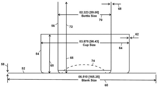 A cross section of the side view of the various intermediate stages; blank (disc) size, cup size, and bottle size [7].