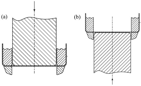 The die material in the backward extrusion process could be cemented carbide. Extrusion slugs are positioned in the container (die) with the precise shape [3,4,13]. Then, the steel ram is directed into the front surface of the slug (billet), forming the desired hollow body backwardly. The forward motion of the ram stops at a distance from the bottom of the container equal to the desired thickness of the base of the extruded hollow body [13]. After forming the initial shape, the container (cylinder) is removed from the ram using a counter-ram ejector [4]. The ram and die dimensions are designed in such a way that they leave a gap between the ram and the side walls of the die. This gap matches the intended thickness of the extruded material [13]. The slug (disc) diameter could be slightly smaller than final product (0.5 mm). This container may serve as a beverage container or aerosol container. The height and thickness of the beverage container could be 1.8–11 and 0.003–0.08 inches, respectively. The height of the aerosol container could be 2.3–9.5 inches [4].