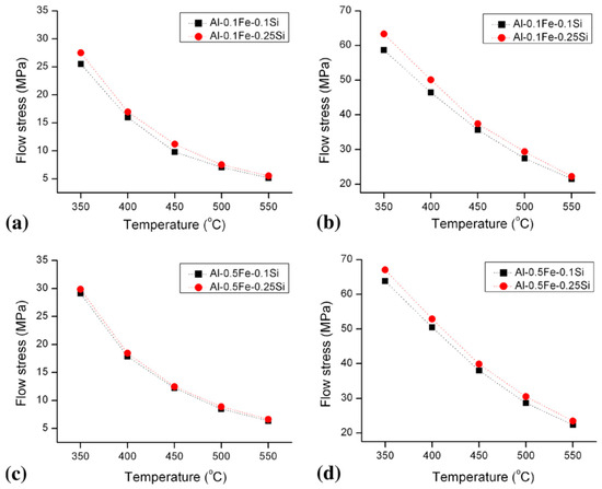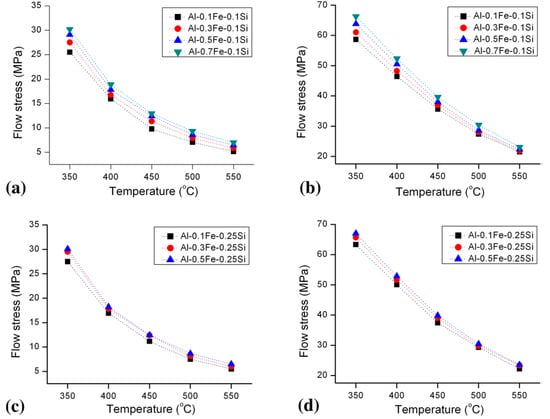 Impact of Si on the flow stress with a strain of 0.8 and (a) Al-0.1Fe-Si εº = 0.01 s−1, (b) Al-0.1Fe-Si εº = 10 s−1, (c) Al-0.5Fe-Si εº = 0.01 s−1 and (d) Al-0.5Fe-Si εº = 10 s−1 [18].