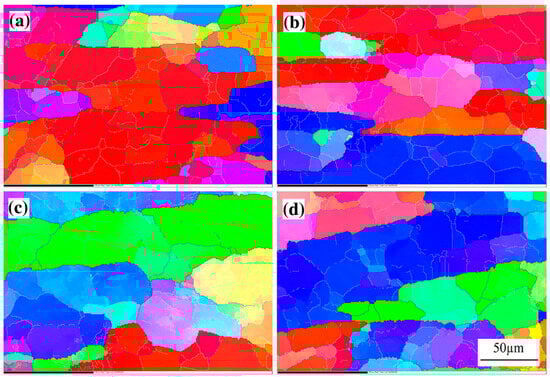 EBSD maps showing the microstructure of the as-cast low-Mn alloy and high-Mn alloys after annealing at different temperatures for 105 s. (a) the as-cast low-Mn alloy, T = 400 °C, grain size: 56.5 µm; (b) the as-cast low-Mn alloy, T = 500 °C, grain size: 21.0 µm; (c) the as-cast high-Mn alloy, T = 400 °C, grain size: 205.5 µm; (d) the as-cast high-Mn alloy, T = 500 °C, grain size: 29.7 µm [20].