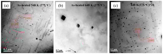 Figure 11 displays the dispersoid precipitation sequences in the dislocation presence in the deformed alloys. After subjecting the deformed alloy to heating at 275 °C, both β’ precipitates in the [001]Al zone axis and dislocations in [011]Al zone axis were observed (Figure 11a,b). When the deformed alloy was held at 648 K (375 °C), the β’ precipitates were dissolved and numerous dislocations were still present within the aluminum matrix. With further increase in holding time, the dispersoids and dislocations coexisted within the aluminum matrix (Figure 11c). Interestingly, most of the dispersoids precipitated along dislocation lines (Figure 11c). Due to the presence of numerous dislocations, the rapid diffusion of alloying elements weakened the advantage of local Si enrichment resulting from the dissolution of β’ precipitates for α-Al(MnFe)Si dispersoid nucleation [5].