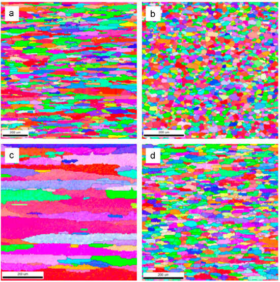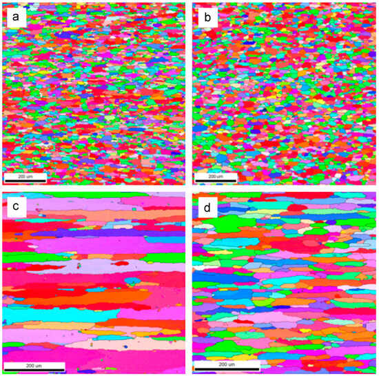 EBSD maps showing the microstructure of the as-homogenized low-Mn alloy and high-Mn alloys after annealing at different temperatures for 105 s. (a) the as-homogenized low-Mn alloy, T = 400 °C, grain size: 24.2 µm; (b) the as-homogenized low-Mn alloy, T = 500 °C, grain size: 23.4 µm; (c) the as-homogenized high-Mn alloy, T = 400 °C, grain size: 115.2 µm; (d) the as-homogenized high-Mn alloy, T = 500 °C, grain size: 43.9 µm [20].