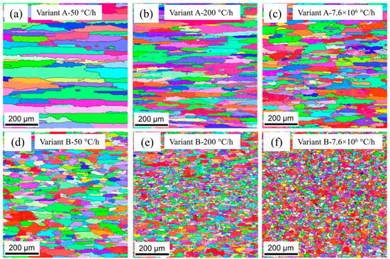 The EBSD micrographs showing the microstructure after annealing at different heating rates to 400 °C and hold for 105 s for (a) Variant A-50 °C/h; (b) Variant A-200 °C/h; (c) Variant A-7.6 × 106 °C/h; (d) Variant B-50 °C/h; (e) Variant B-200 °C/h; (f) Variant B-7.6 × 106 °C/h [6].