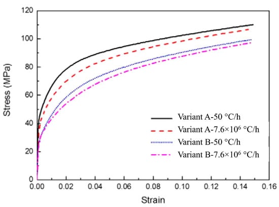 The stress-strain curves (strain rate of 10−3 s−1) for both variants, annealed at rates of 50 °C/h and 7.6 × 106 °C/h to 400 °C for 105 s [6].