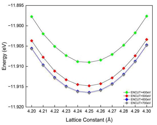 The electronic structure of undoped MgO was investigated first. Considering that the cutoff energy of plane wave expansion and the dimension of the k point mesh are two parameters that largely determine the calculation accuracy, convergence tests were conducted in a MgO unit cell. As shown in Figure 2, cutoff energies ranging from 400 to 700 eV were tested. The lattice constant converged at 4.25 Å, independent of the cutoff energy.