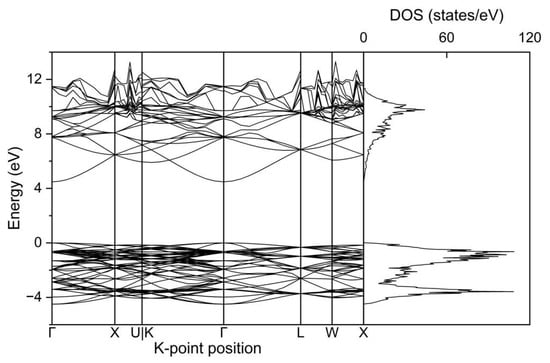 The valence band maximum and conduction band minimum of the band gap were located at the Γ point, indicating that the simulated MgO is a direct band gap material, in agreement with other calculation results. The calculated band gap was 4.58 eV, which is smaller than reported experimental values of 5.5 eV [15], 5.8–5.9 eV [15,18], and 7.2 eV [23]. This difference has been attributed to the framework of density functional theory, where the mutually interacting nature between electrons is approximated by the exchange-correlation functional, which is not exact. The projected contributions from the orbitals of the Mg and O atoms to the band structure of MgO are shown in Figure 4. Both Mg and O atomic orbitals are distributed throughout the valence band and conduction band. The VBM (valence band maximum) is mainly composed of the 2p orbital of the O atom. 2s, 2p of the O atom and 3s of the Mg atom contribute to CBM (conduction band minimum). The O 2p orbital had the most dispersive distribution throughout the band structure of pristine MgO.