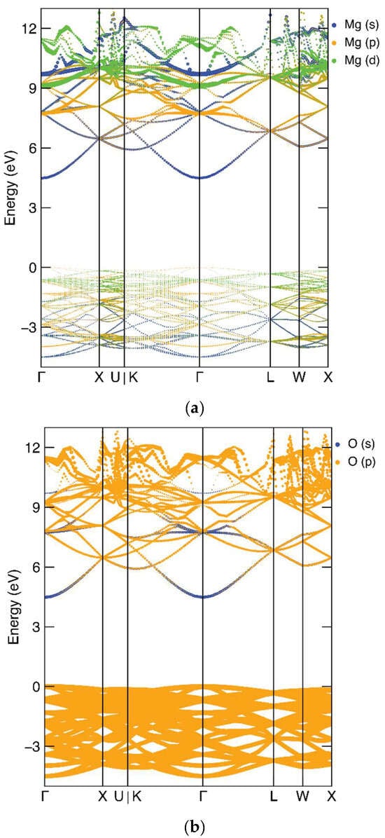 Orbital projected band structure of pristine MgO: (a) s, p, d orbitals of Mg; (b) s, p orbitals of O.