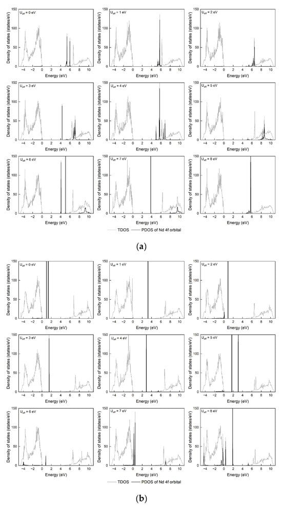 Density of states of rare-earth-doped MgO, Ueff ranges from 0 to 8 eV: (a) Nd: MgO; (b) Er: MgO.