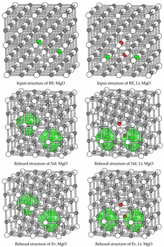 Initial and relaxed supercells of RE: MgO and RE, Li: MgO. RE: Nd or Er. V: Mg vacancy.