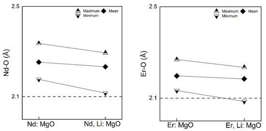 The dashed line in the middle indicates the Mg-O bond length in the pristine MgO, which is 2.125 Å. The bond lengths of the rare earth dopant are the interatomic distances between the rare earth dopant and its six nearest oxygen atoms. As the coordinates of each atom in the system are available from the calculations, the inter-atomic distances can be readily obtained. There are six RE-O bonds in each coordination polyhedron. The mean RE-O bond lengths in all four calculated systems were greater than 2.125 Å. This increase in the bond length is understandable as both Nd and Er possess larger ionic radii than Mg. Under the energy equilibrium condition, oxygen atoms move to a farther distance to relax. As ionic Nd is larger than Er, the mean Nd-O length is larger than the mean Er-O length. Decreases in the mean, maximum, and minimum bond lengths were found in Li co-doped systems. The decrease is more apparent in Nd-doped MgO than in Er-doped MgO.