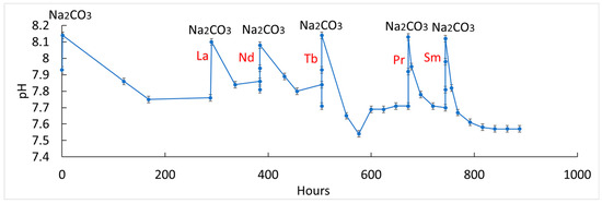 Evolution of pH in the experimental solution. This solution was replaced after the end of each growth cycle, i.e., a few minutes before REE spike and Na2CO3 aliquot were introduced.