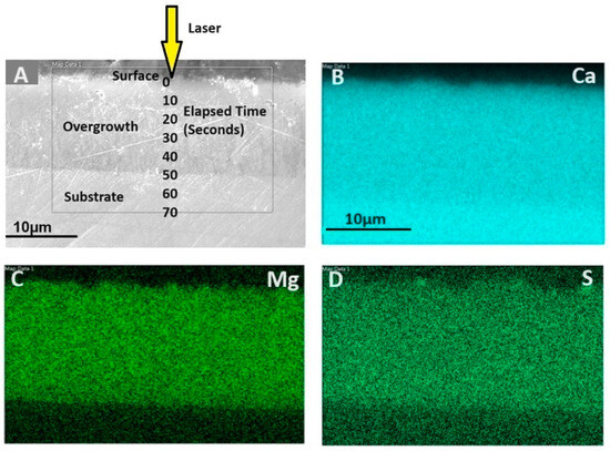 SEM BSE (A) and EDS (B–D) imaging of the substrate and newly formed calcite. (A) An example of an SEM BSE map of the substrate and newly formed calcite. The arrow shows the direction of laser ablation. The elapsed ablation time scale is positioned on the map, showing that the overgrowth/substrate boundary was reached after 50 s of ablation. (B–D) Brighter colors on EDS maps indicate higher concentrations of Mg and S in calcite overgrowth. These BSE and EDS maps were collected during the development of the calcite growth method (Gabitov et al. [47]).