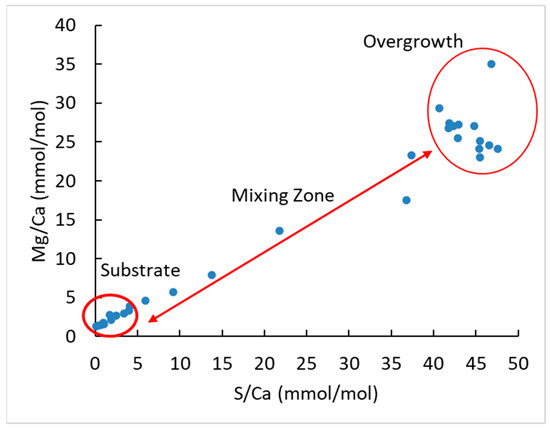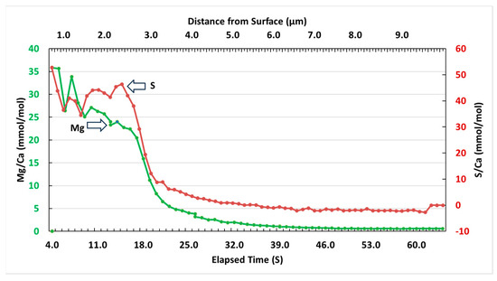 The ratios of E/Ca were examined against distance from the surface of the newly formed calcite layer (0 µm). Figure 6 shows an example of Mg/Ca and Sr/Ca depth profiles, where overgrowth is enriched in Mg/Ca and Sr/Ca compared to the substrate, which is consistent with our previous findings [46,52]. In this figure, the overgrowth layer is defined from 0 to 2.7 µm (19 s of ablation time), and therefore, average values of Mg/Ca and S/Ca collected in this layer (0 to 2.7 µm) represent the average values of the overgrowth. A monotonic decrease in Mg/Ca and S/Ca after 19 s of ablation likely corresponds to the mixing zone, followed by substrate, where both ratios dropped to near-constant values.
