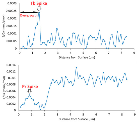 The existence of the overgrowth, which was evaluated using SEM, was confirmed with LA-ICP-MS depth profiling, which showed a gradual (rather than sharp) transition of E/Ca while crossing the boundary between overgrowth and substrate (Figure 4). Typically, these profiles show three distinct groups of data, corresponding to the calcite overgrowth, the calcite substrate, and a mixing area. This mixing zone is likely a result of micro-asperities at the junction of the substrate and overgrowth.