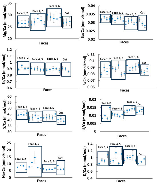 Average values of Mg/Ca, Sr/Ca, S/Ca, Ba/Ca, Li/Ca, Na/Ca, and K/Ca for different pairs of faces and randomly cut sections.