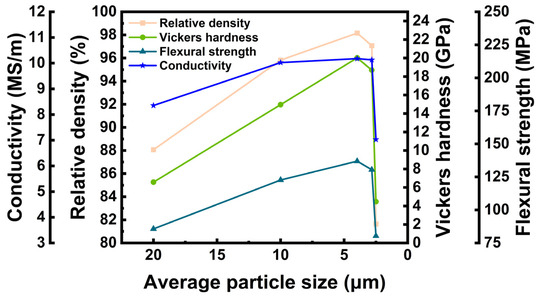 Figure 2 shows the variation in the relative density, electrical conductivity, Vickers hardness, and flexural strength with particle size.