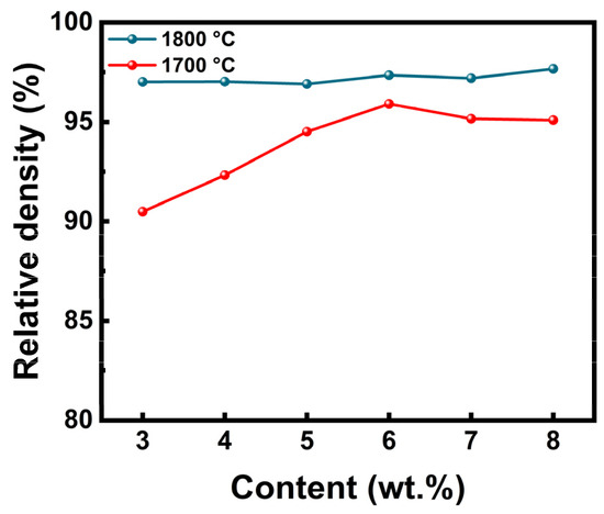 6 is approximately 1800 °C, and the sintering aid effect of ZAT is not significant. At a temperature of 1700 °C, the sintering aid has a significant effect on improving density. The maximum relative densities of 95.9% and 97.4% were achieved at sintering temperatures of 1700 °C and 1800 °C, respectively, with a ZAT content of 6 wt.%.