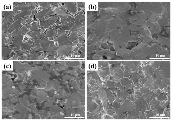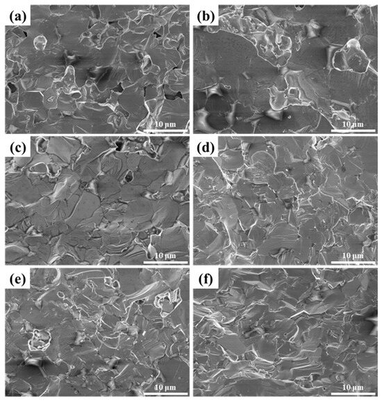 6 ceramics occurs as the particle size of the raw materials diminishes. With increasing density, fractal-type cracks began to gradually emerge in the samples’ cross-sectional morphology. This indicates the occurrence of transgranular fractures. Sections of ceramics, prepared by HPS of powders with an average grain size of 20 μm, demonstrate that the grains are only slightly connected to each other at the neck. When the average grain size is reduced to 10 μm, the cross-section shows tighter necking between grains. The pores consist of small closed pores within grains and open pores between grains.
