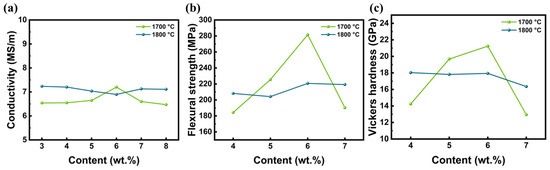 6 ceramics with ZAT contents at different temperatures. At a sintering temperature of 1700 °C, the change in ZAT content has a greater impact on the ceramic properties compared to a sintering temperature of 1800 °C. The flexural strength and Vickers hardness of the ceramics at 1700 °C increased and then decreased with increasing ZAT content, as did the electrical conductivity. The mechanical and electrical properties of the ceramics prepared at 1800 °C show a weaker trend. Changes in the density of the ZAT content are closely related to these modifications, while the oxides have a direct impact on the mechanical and electrical properties of the ceramic, giving it less Vickers hardness and less conductivity.