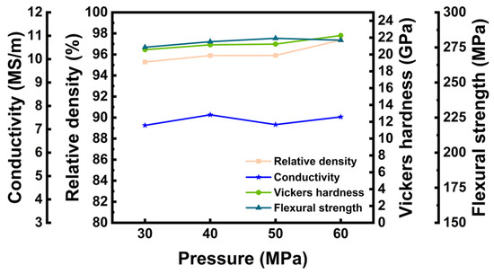 In particular, the ceramic has the highest flexural strength of 281.5 MPa, the highest Vickers hardness of 21.2 GPa, and the highest conductivity of 7.2 MS/m at 6 wt.%. Based on this result, the ZAT content of the powders used in the subsequent experiments on the effect of temperature and pressure on properties was 6 wt.%.