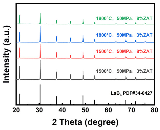To fabricate LaB6-ZAT ceramics, the LaB6-ZAT mixed powder was placed in a 30 mm diameter split graphite mold and then into a vacuum hot press sintering furnace. A temperature increase rate of 6 °C/min and an initial pressure of 7–8 MPa to 600 °C were first used. It was then heated to 1500–1900 °C in an argon atmosphere at a rate of 20 °C/min. Subsequently, it was maintained at this temperature for 1 h before being sintered through hot pressing at a uniaxial pressure of 30–60 MPa.