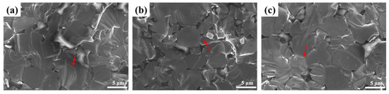 6-ZAT ceramics prepared at various pressures at 1700 °C. With increasing pressure, pores at the grain boundaries are progressively eliminated and reduced, although the changes are not significant, aligning with the relative density data. This is because increased pressure brings the particles closer together, resulting in diffusion over shorter distances. Furthermore, increasing pressure provides additional energy, thereby accelerating diffusion. Overall, pressure exerts minimal impact on the relative density of LaB