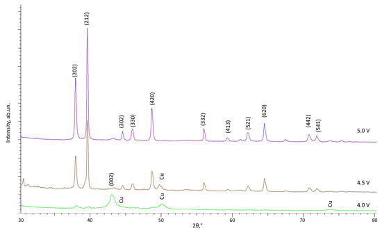 The general appearance of the presented diffraction patterns, depending on changes in synthesis conditions (with variations in the difference in applied potentials), indicates not only changes in the structural ordering degree (expressed in changes in the shape and intensity of diffraction reflections), but also the processes of phase transformations that appear at applied potential differences above 3.0 V. In the case of applied potential differences from 2.0 to 3.0 V, the main positions of the diffraction reflections presented in the X-ray diffraction patterns correspond to the cubic phase of Cu (PDF-00-004-0836), the formation of which is due to the processes of electrochemical reduction in the metal deposit, as well as the potential for the reduction in copper from sulfuric acid aqueous solutions–electrolytes [