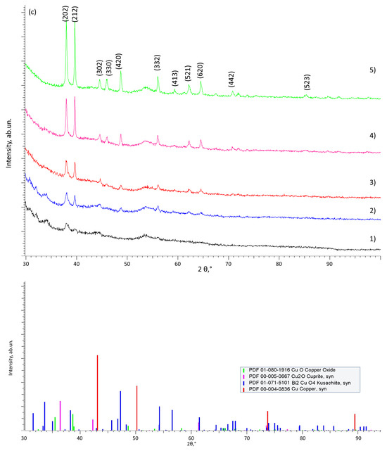 Figure 2c shows the results of X-ray diffraction of the studied samples of CuBi/CuBi