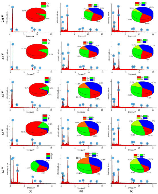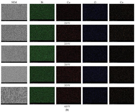 Figure 4b reveals the assessment results of the change in the elemental composition of the synthesized films with varying applied potential difference, according to which we can conclude that, with an increase in the applied potential difference, copper is partially replaced by cobalt in the composition of the films, the content of which changes from 7.7 at.% at an applied potential difference of 2.0 V to 22.3 at.% at an applied potential difference of 4.0 V. At the same time, no change in the bismuth content in the composition of the films was observed when the synthesis conditions changed, which also indicates that the main substitution is associated with the displacement of copper and its substitution with cobalt. It is also worth noting that, when the applied potential difference changes, a slight decrease in oxygen is observed, the decrease of which may be due to structural ordering.