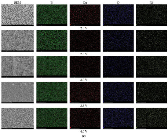 Figure 4) associated with the fact that the main changes in the elemental composition of films with an increase in the applied potential difference from 2.0 to 2.5 V occur due to an increase in the weight contribution of bismuth, the content of which increases from 6.6 at.% to 12.5 at.%. Moreover, such a change is in good agreement with the data on changes in the parameters of the crystal lattice presented in