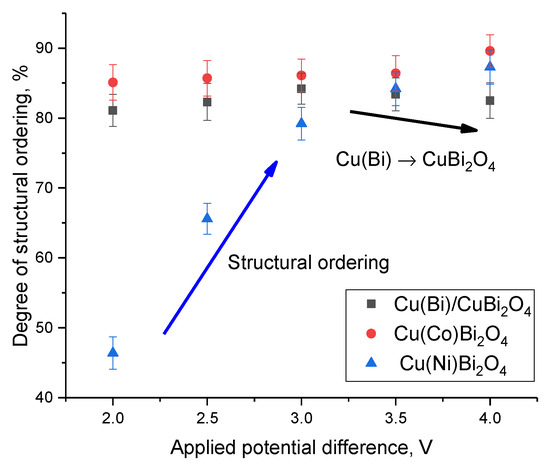 Table 1), which may be associated with the effects of replacing copper with cobalt. At the same time, a change in the synthesis conditions (i.e., a variation in the applied potential difference) in the case of adding cobalt sulfate to the electrolyte solution does not lead to phase change processes, and the structure of the resulting films in the entire studied range of the applied voltage difference is represented by the tetragonal CuBi