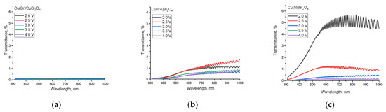 4 phase in the films at applied potential differences of 4.0 V leads to a slight increase in the transmission intensity, which may be due to phase changes in the films. In the case of addition of cobalt to the composition of the films, an elevation in transmission intensity is observed in the region above 500 nm, and in the case of the IR range, characteristic interference bands for the PET polymer film, which is the substrate for the synthesized films, are observed. A growth in cobalt content, meanwhile, results in a transmission intensity reduction, which is due to the metallization effect associated with the replacement of copper by cobalt, as well as changes in structural features and degree of crystallinity. For films obtained using an electrolyte with the addition of nickel sulfate, in the case where the films are of an X-ray amorphous nature, the transmittance in the visible and near-IR ranges is rather high, which indicates a direct influence of the degree of structural ordering on the optical properties of the synthesized films. In the case when Cu(Ni)Bi