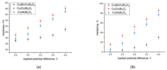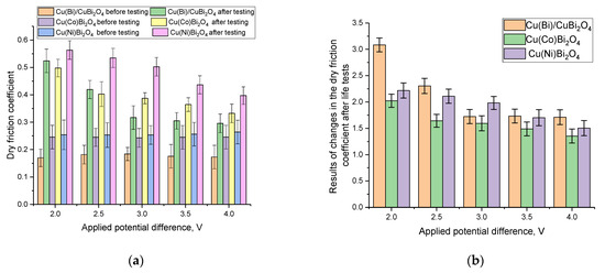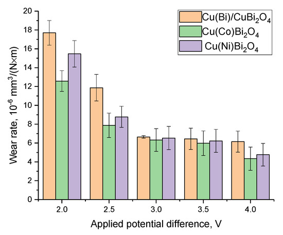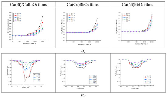 Figure 11a). At the same time, the most pronounced changes are observed for films obtained at potential differences of 2.0–3.0 V, in which the cubic phase of copper dominates, which has a fairly low resistance to degradation during wear resistance tests. In turn, phase transformations of the type Cu(Bi) → CuBi