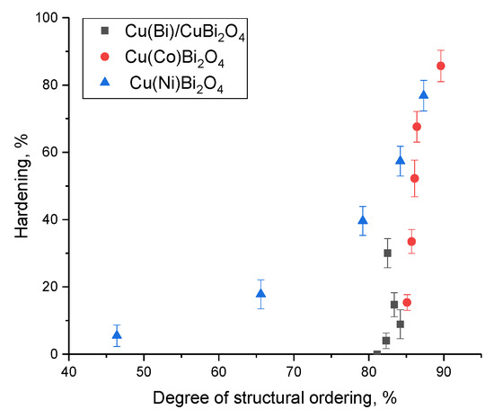 Based on the obtained data on changes in hardness values, hardening factors were calculated, which characterize the effect of changes in strength parameters depending on changes in the degree of structural ordering and phase composition of CuBi/CuBi