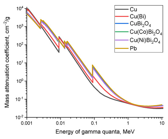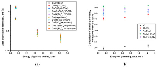 Figure 14b presents the results of the shielding efficiency (mass attenuation coefficient) of the films under study for all three types of gamma ray energy in comparison with the value of the mass attenuation coefficient of lead obtained from the simulation results using the XCOM code. As can be seen from the presented data, the synthesized CuBi