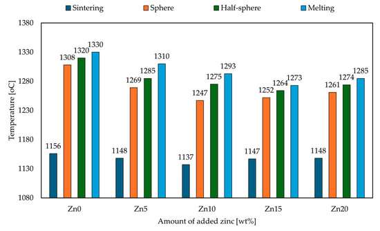 Such values indicate that zinc oxide flux reduces characteristic temperatures to some extent. Added high amounts of zinc oxide do not provide any benefits in terms of lowering characteristic temperatures; therefore, it is economically unprofitable. The most optimal additive for reducing characteristic temperatures appears to be between 10 and 15 wt.% zinc oxide. The addition of such an amount allows zinc oxide to perform as an optimal flux. Furthermore, the addition of higher amounts does not affect the fluxing effect, but may already have a glass-forming effect, which has been confirmed in some studies [11,12,13,14,15,16].