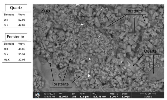 The microstructure of the Zn5 glaze showed similarity in terms of forsterite crystal clustering and size. Glazes with a zinc oxide addition of 5 wt.% showed much smaller forsterite crystals, whose shape was slightly different from that observed in Zn0 glazes. In this case, the edges of the crystallites were not as sharp and distinct, indicating that they may not have been as well-developed as in the previous glaze. Residual quartz crystals were also observed in this glaze. However, no willemite crystals were observed according to phase composition analysis (Table 2). This finding may be due to fewer amounts in the sample or their small size.