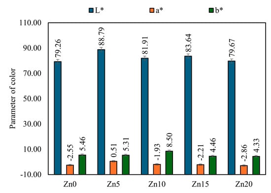 Surface color tests were performed for each glaze by measuring the color parameters ten times for each sample. The results are presented in Figure 11. Based on the data obtained, a change in the value of the L* parameter (brightness) was observed after adding zinc oxide to the glaze. A 5 wt.% addition of ZnO caused the value of this parameter to increase from 79.26 to 88.79, which was the highest value for this parameter out of all glazes tested. For ZnO additions in the amounts of 10 and 15 wt.%, an increase in the brightness value of the glaze color was also observed. The highest addition resulted in the value of the L* parameter being at the level of the base glaze.