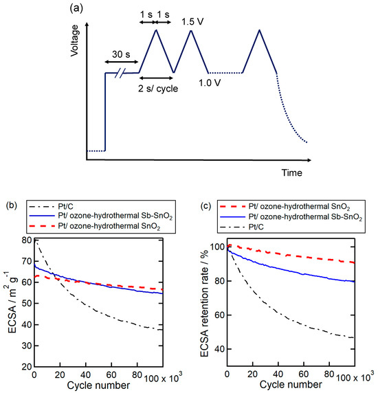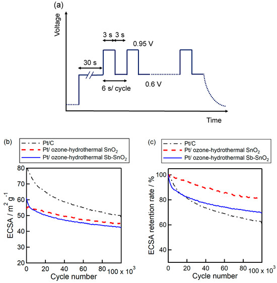 - Takei, C.; Kobayashi, R.; Mizushita, Y.; Hiramitsu, Y.; Kakinuma, K.; Uchida, M. Platinum Anti-Dissolution Mechanism of Pt/Nb-SnO2 Cathode Catalyst Layer during Load Cycling in the Presence of Oxygen for Polymer Electrolyte Fuel Cells. J. Electrochem. Soc. 2018, 165, F1300–F1311. [Google Scholar] [CrossRef]