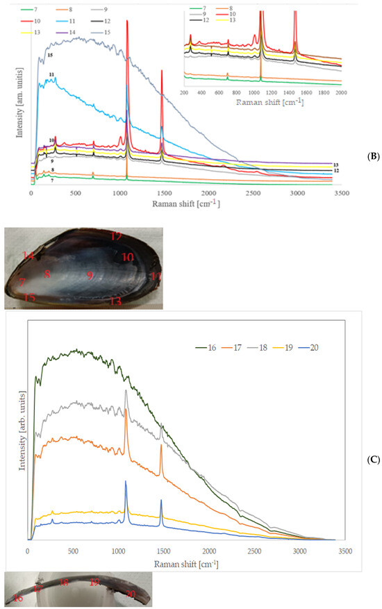 Micro-Raman spectroscopy is a powerful tool for carrying out point-by-point compositional analyses and identifying the present phases. Raman spectra of some points of a valve of an untreated specimen, sampled on both the external and internal surfaces and on the section as well, are shown in Figure 5A and Figure 4B,C, respectively. The points, chosen randomly in such a way as to fully present the characteristics of the shell, represent areas where Raman spectra have been acquired which are then reported in the following figures. The external face appears bluish-dark grey with not very noticeable growth lines; on the contrary, the inner face is mother-of-pearl almost everywhere because of the presence of the so called nacre, even if on the extremity it is darker, and a rather dark area where the posterior adductor muscle of the animal was attached is easily recognisable (zone number 10); the section, not constant in thickness in all its parts, is instead whitish-yellowish.