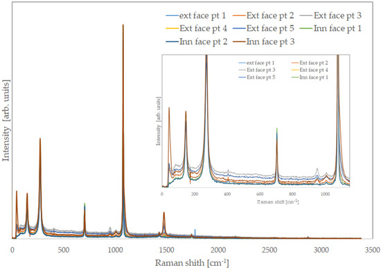 Inorganic components were more recognisable than on the inner face, and it was possible to discriminate areas where calcite was more abundant (external face and thin end), where aragonite was predominant (internal face thick end), or they coexisted (some central areas). After the complete treatment, the organic part was almost completely gone, as it is possible to observe in Figure 6, which shows Raman spectra collected in several points of the external and inner faces. Raman spectra collected on samples treated for a short period of time show the bands due the organic components. The longer the treatment, the weaker they become.