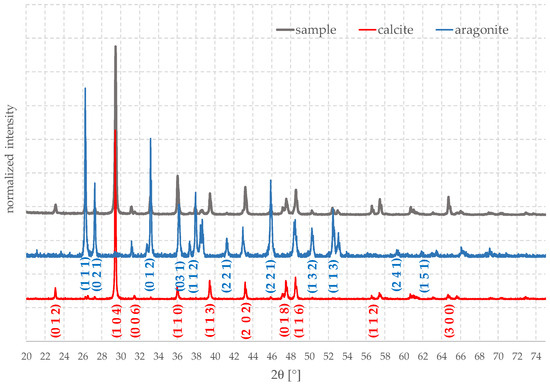 Once the organic part has been removed, it is possible to evaluate the ratio between the different polymorphs present overall. For doing this and to evaluate the possible presence of amorphous phases, a sample, after being treated by peroxide, was carefully ground in an agate mortar. The diffraction pattern (XRD) of the obtained powder was acquired (Figure 7); according to these results, it turned out that the valve was made mainly by calcite, about 75%, and the rest was aragonite.