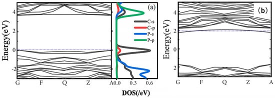 The energy band of the structure has two split impurity levels of approximately 0.7 eV above the valence band, contributed by the s-orbitals of the C. Although the P-V doping structure is more stable than the P substitution doping, the band structure shows that the impurity level of the P substitution doping is located near the conduction band and has a typical n-type semiconductor band feature. However, P-V-doped diamond is a typical P-type semiconductor that is not suitable for applications in n-type devices.