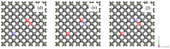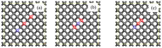 From the structure of N as a cluster state, Dai Ying et al. [15] constructed some P-B co-doped structures containing two P atoms and one B atom as shown in Figure 3. Although the minimum concentration of doping was used in (3 × 3 × 3), the doping concentration was as high as 278 ppm. This doping concentration was nearly a hundred times different than the 3 ppm that could be achieved in practice. And to achieve the actual doping concentration, it required the larger model structure, about (14 × 14 × 14), so the structure with a small doping concentration could only be selected as far as possible for simulation calculation.