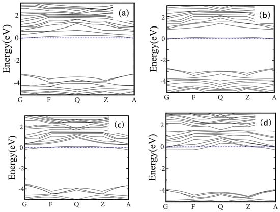 P-B co-doped diamond band structures: (a) P-P-B, (b) P-C-P-C-B, (c) P-P-C-C-C-B, (d) B-P- C-C-C-P. (The blue dotted line is the Fermi energy level).