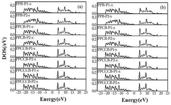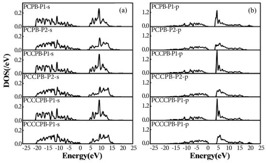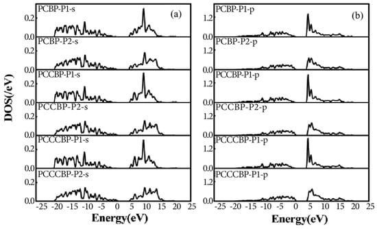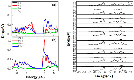 Figure 5a,b depicts the electronic density of states for two distinct doping configurations: (a) P-B-P and (b) P-C-P-C-B. In the former structure, a representative cluster state arrangement is observed, with two P atoms positioned symmetrically and exhibiting nearly identical electronic density of state profiles. Conversely, in the latter structure, the doped atoms are not in direct proximity, and the two P atoms do not occupy symmetric positions, leading to a lack of direct interaction. A comparison between the electronic density of states of different P atoms in the P-P complex in Figure 6 and the electronic density of states of the B atom in Figure 5c reveals that the B atom, when in contact with the P atom, does not significantly contribute to the impurity level, with all impurity levels primarily originating from the P atom. The s- and p-orbital energy of the forbidden B atoms are below 0.6 eV, while the distant P atoms have energies up to 1.2 eV.