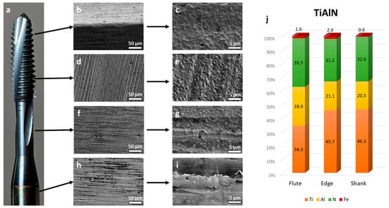 (a) Photograph of TiAlN-coated tool sample. Four regions of the tool were examined: the cutting edge, the flute valley, the shank, and an uncoated area. Data from these four regions are presented as (b–i) SEM images from (b,c) the cutting edge, (d,e) the flute valley, (f,g) the shank, and (h,i) an uncoated area and (j) elemental distribution (wt%) from EDX data.