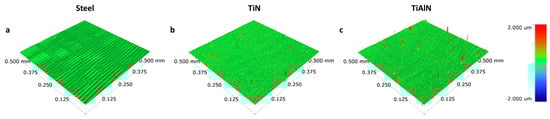 Despite the enhanced surface quality achieved through improved polishing techniques, the process of coating deposition inherently leads to an increase in surface roughness. This is evidenced by the findings of 3D profilometry scans performed on flat steel samples (Figure 4). The original arithmetic mean roughness (Ra) of the raw surface was determined to be 20.9 ± 8.0 nm. Following the application of a TiN coating, the roughness increased to 39.3 ± 5.0 nm. Subsequently, after the deposition of a TiAlN coating, the roughness was measured at 32.5 ± 7.2 nm. The root mean square roughness (Rq) demonstrated a comparable pattern, with a rise from an initial measurement of 28.0 ± 7.4 nm to 60.0 ± 7.2 nm for surfaces coated with TiN and 72.2 ± 26.1 nm for surfaces coated with TiAlN. Significantly, there was a meaningful increase in Rz measurement data. Specifically, the raw surface exhibited a value of 3.8 ± 1.2 µm, while the TiN coating showed an elevation of 6.3 ± 1.3 µm, and the TiAlN coating showed the highest elevation of 7.6 ± 1.5 µm. While the thicknesses of both coatings are alike, TiAlN encounters a lower average roughness but displays a greater number of peaks and valleys in its surface texture compared to TiN.